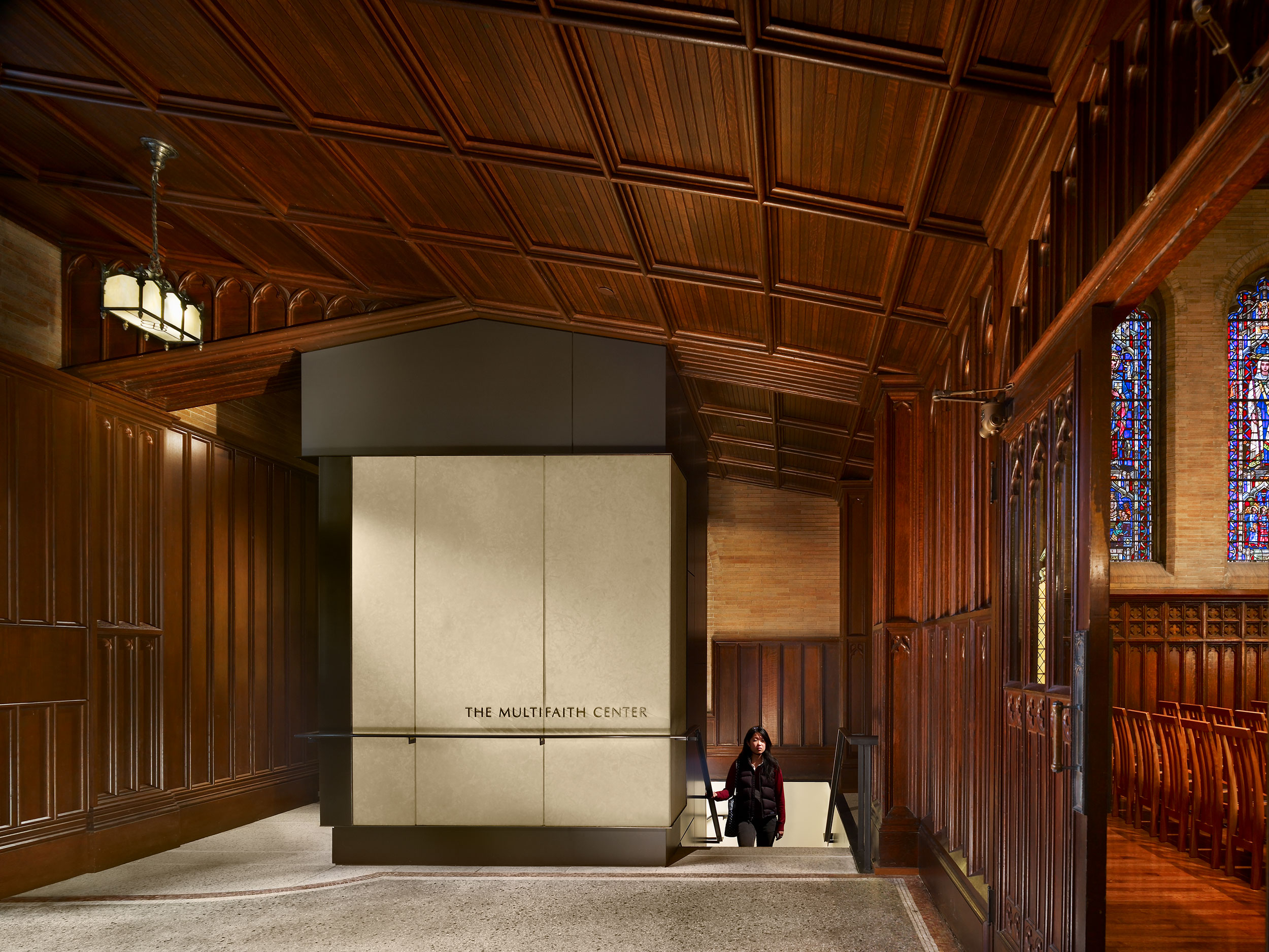 An elevator bay added in the narthex respects the existing ornate wood through the use of Kasota stone and bronze details and makes the Multifaith Center below ground more accessible. © Halkin Photography LLC