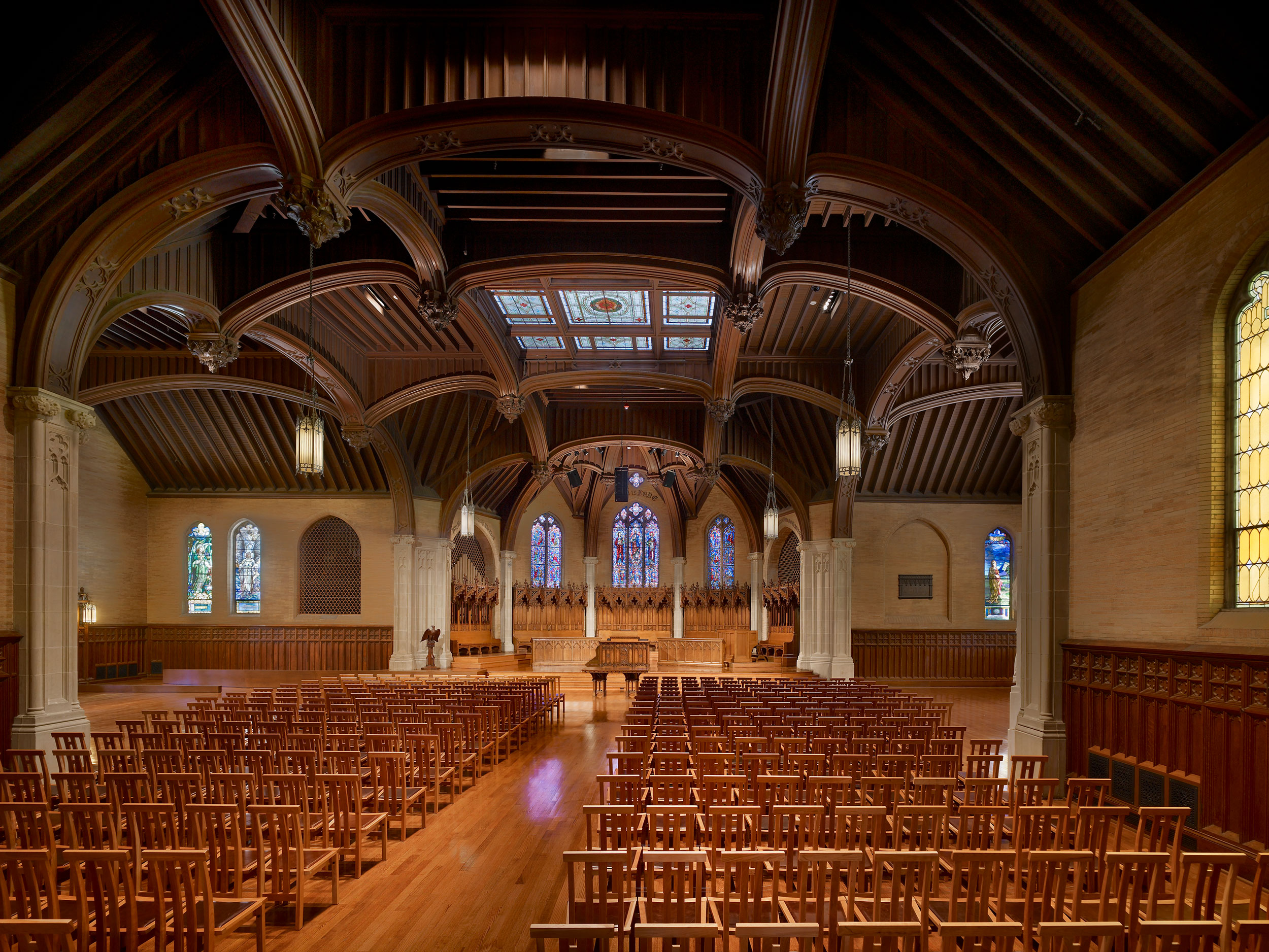 The 125 year-old Houghton Chapel was restored to its original beauty in the first phase of renovation. All building systems were replaced, acoustics were improved, and the building was enhanced with handicap accessibility features, including a discreet ramp to the altar. © Halkin Photography LLC