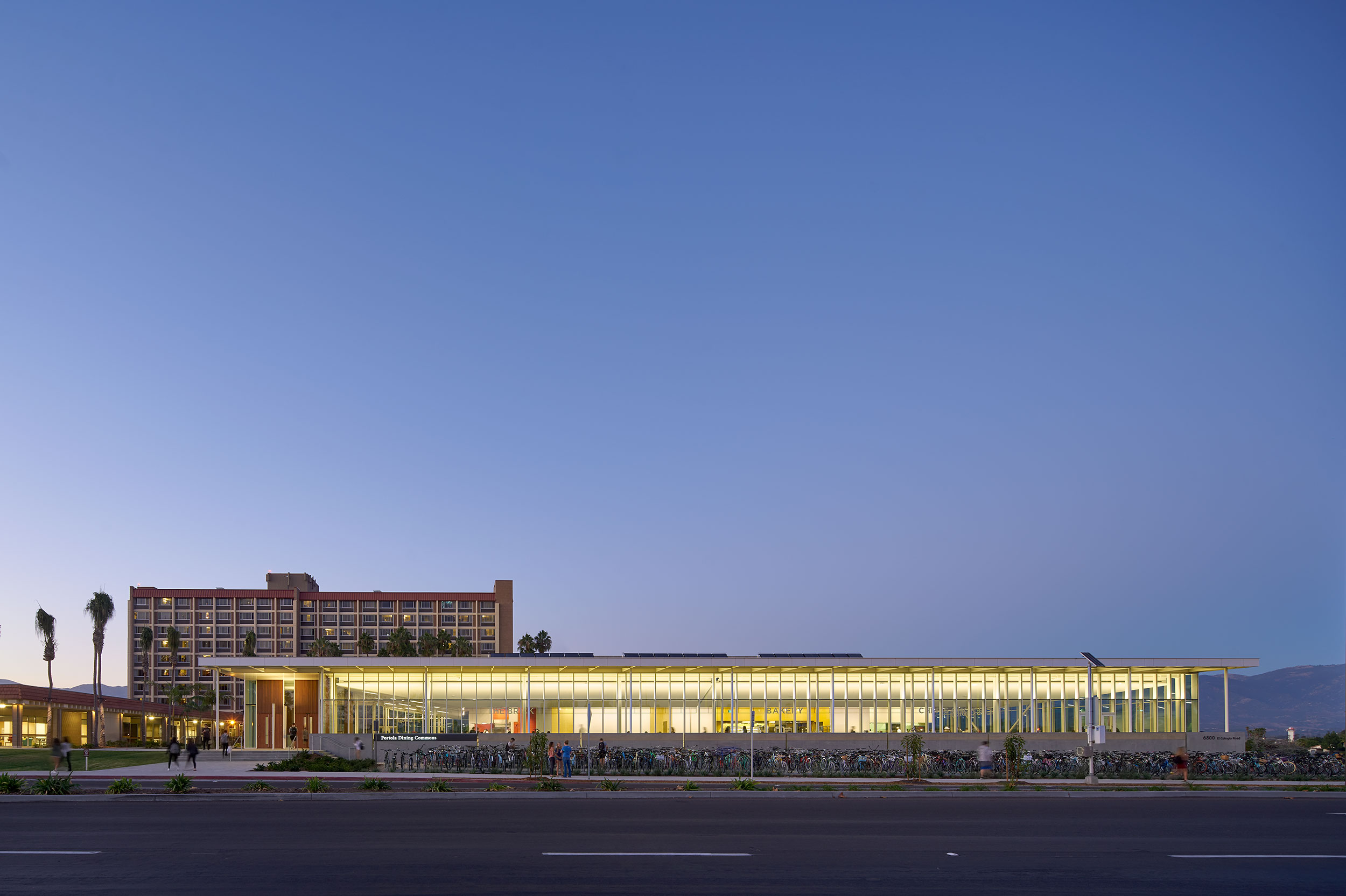 As the threshold for the San Joaquin Village, the building needed to attract visitors while also engaging the public road, transit networks, and campus bike paths as well as Santa Barbara’s mountain and ocean scenery. Rather than compete with the dramatic landscape and bustling activity, the Commons is a “big, beautiful room” whose tall ceilings and full-height windows let the Santa Ynez Mountains and coastal landscape define the building.