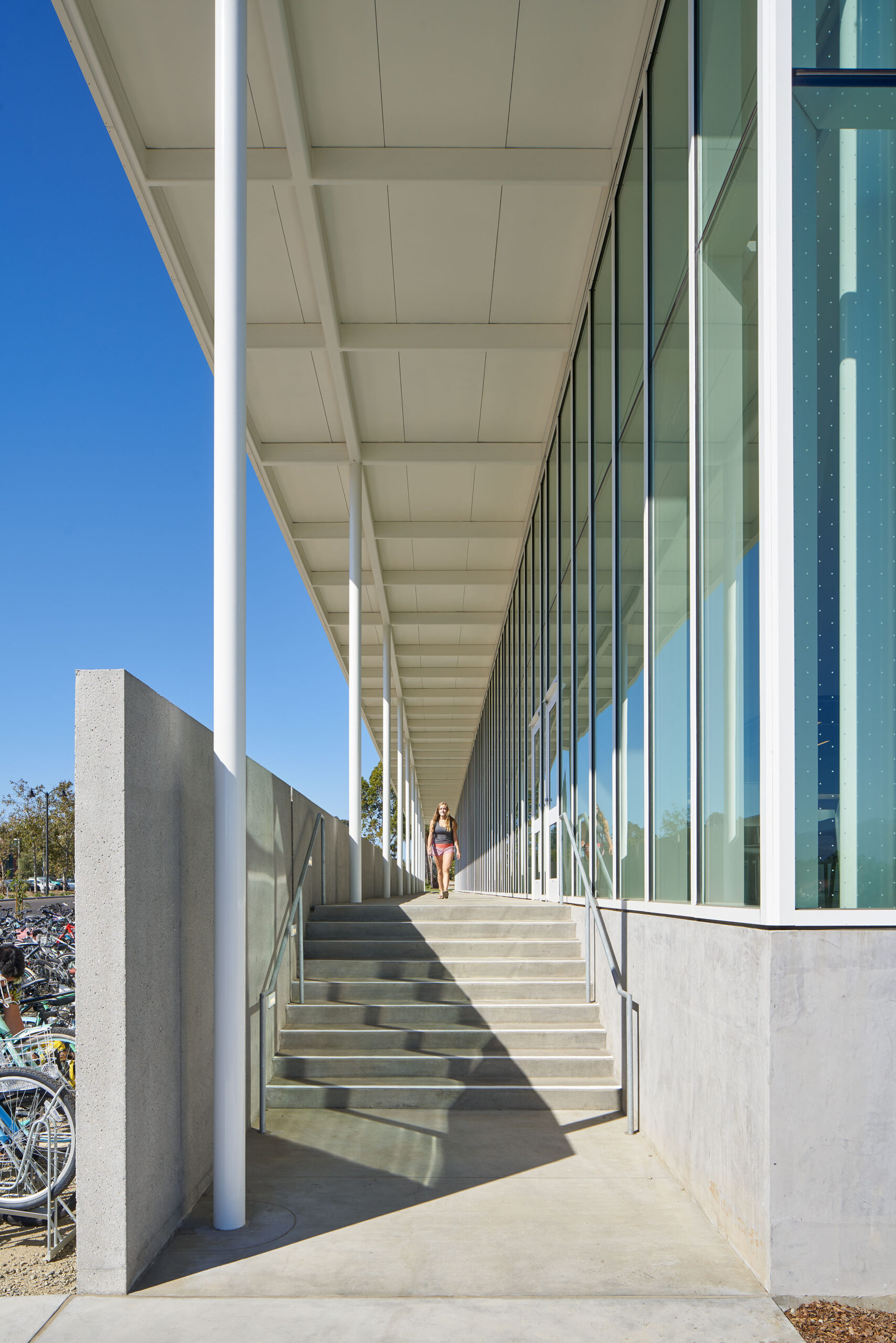 The covered porch welcomes students into the dining hall and helps passively cool the building. | Bruce Damonte