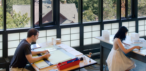 The perimeter walls are entirely glazed with transparent and translucent panels, washing the fourteen-foot-high studios with natural light. To maintain a light transmitting envelope without compromising thermal performance, a curtainwall of triple glazing and insulating translucent spandrel panels was combined with an exterior sunshading system to control glare and prevent solar heat gain in the summer. The envelope not only offers exceptionally high performance but also creates an aesthetically unified building. Along the south wall, as seen against Yale’s gothic structures beyond, the effect is an elegant contemporary gothic tracery derived entirely from the need to mitigate solar gain.