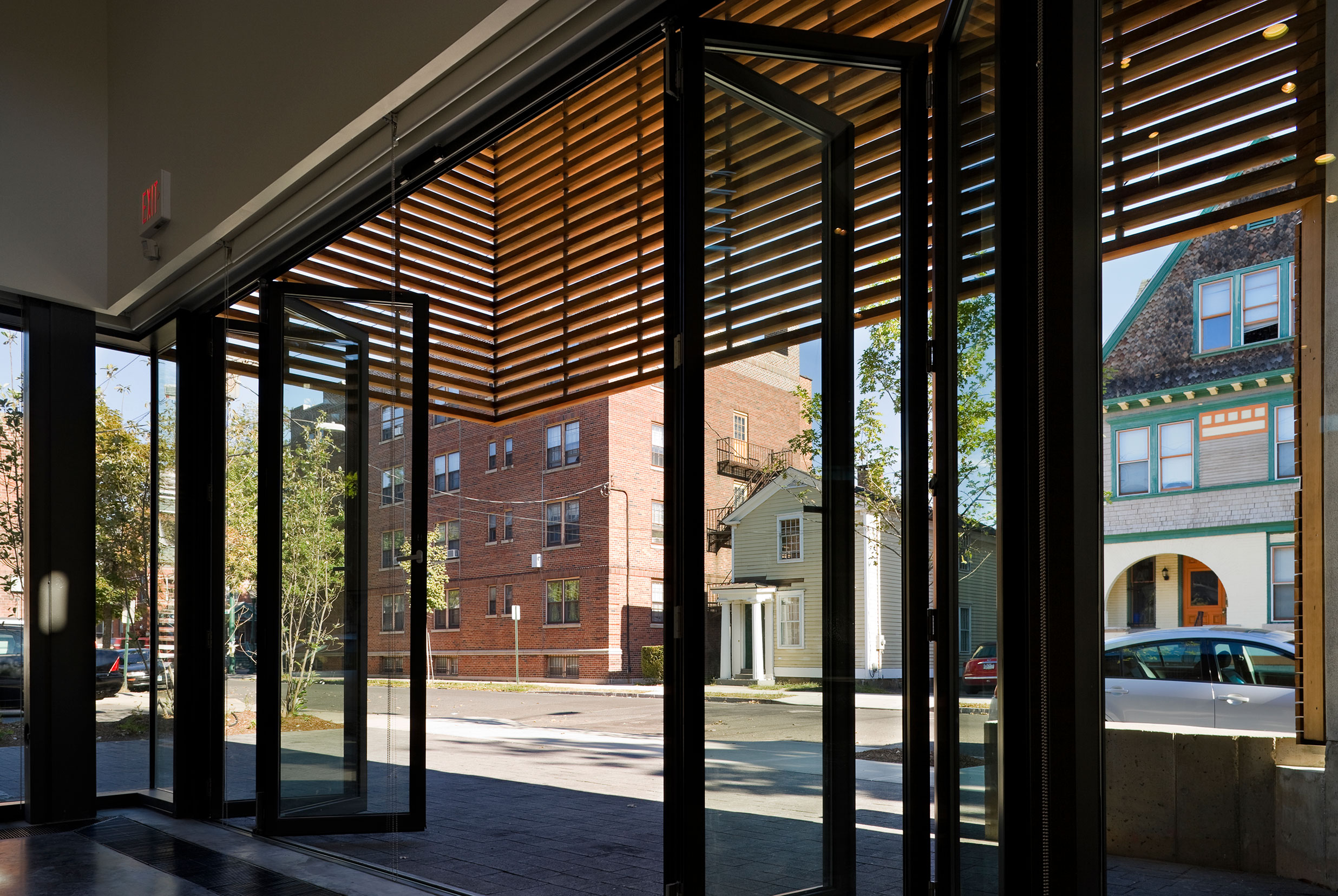 The doors of the art gallery fold back accordion-style to create a porch along the street front in nice weather, inviting visitors inside. © Peter Aaron/OTTO