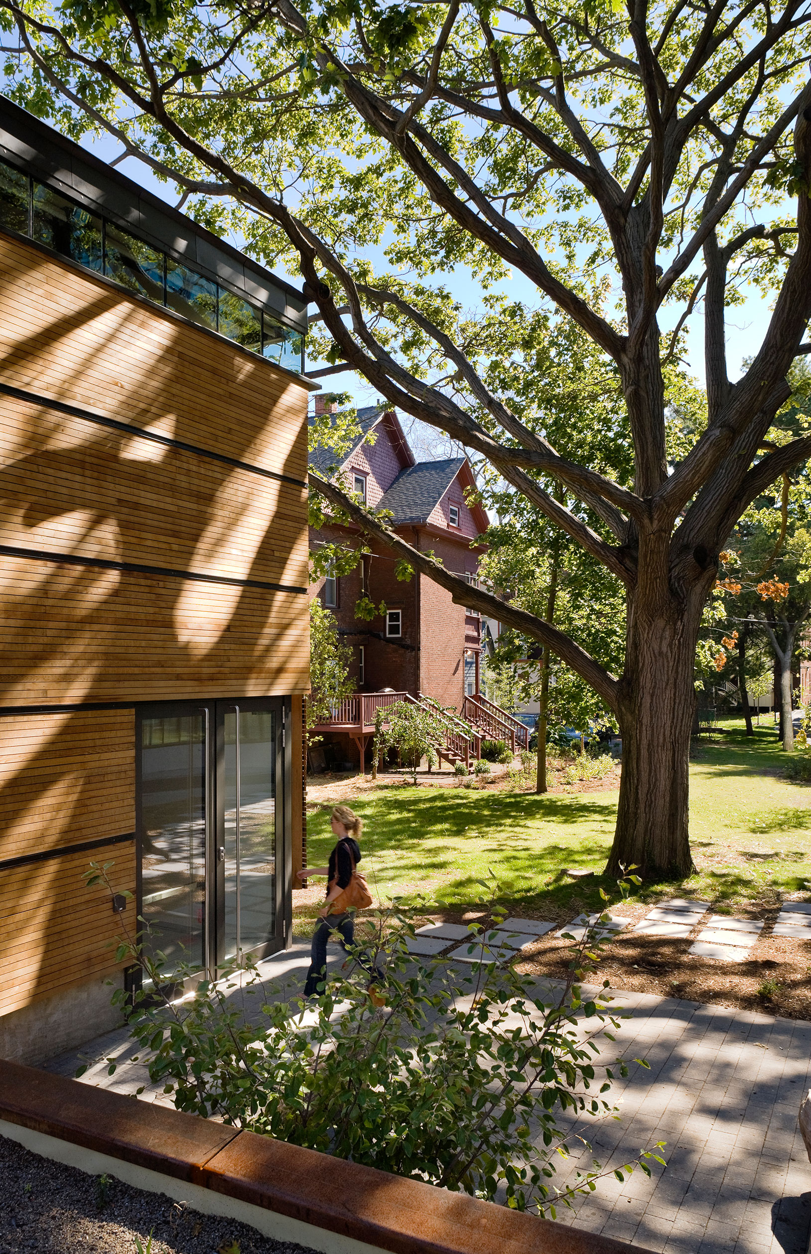 New plantings and shade trees create a park-like setting on the former brownfield site. © Peter Aaron/OTTO