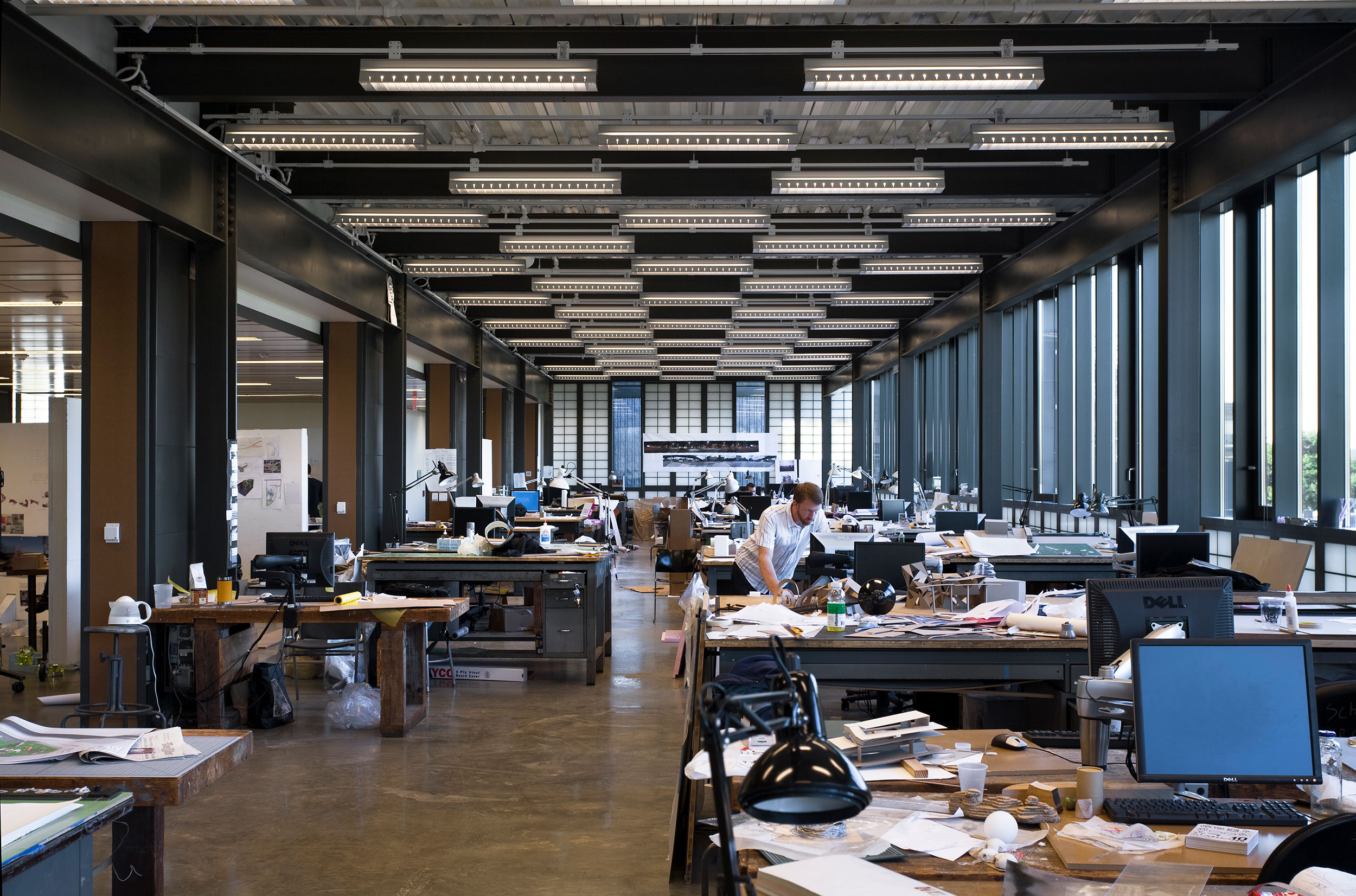 Workshops are equipped with comprehensive exhaust systems that adjust to the number of machines running, ensuring the removal of airborne irritants while preventing a constant exhaust that would waste energy. To ensure that hazardous materials are not introduced on the studio levels and re-circulated through the building, an air monitoring system has been installed. This sampling system can be used for routine monitoring and diagnostics in the event of an air quality problem. © Peter Aaron/OTTO