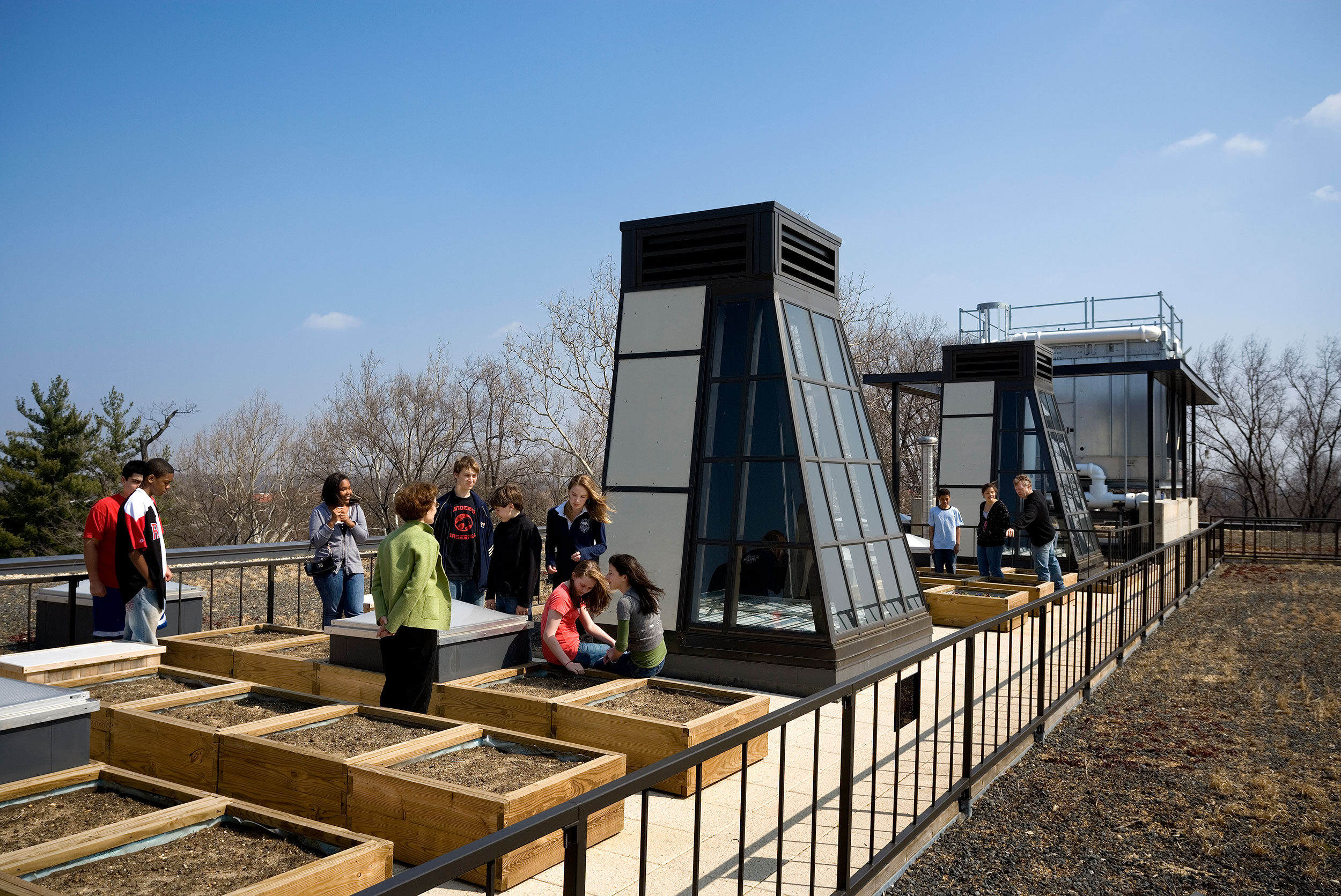 Students tend rooftop container gardens and learn about the functioning of solar chimneys for ventilation, which rely upon the energy of the sun and diminish the need for artificial cooling. © Peter Aaron/OTTO