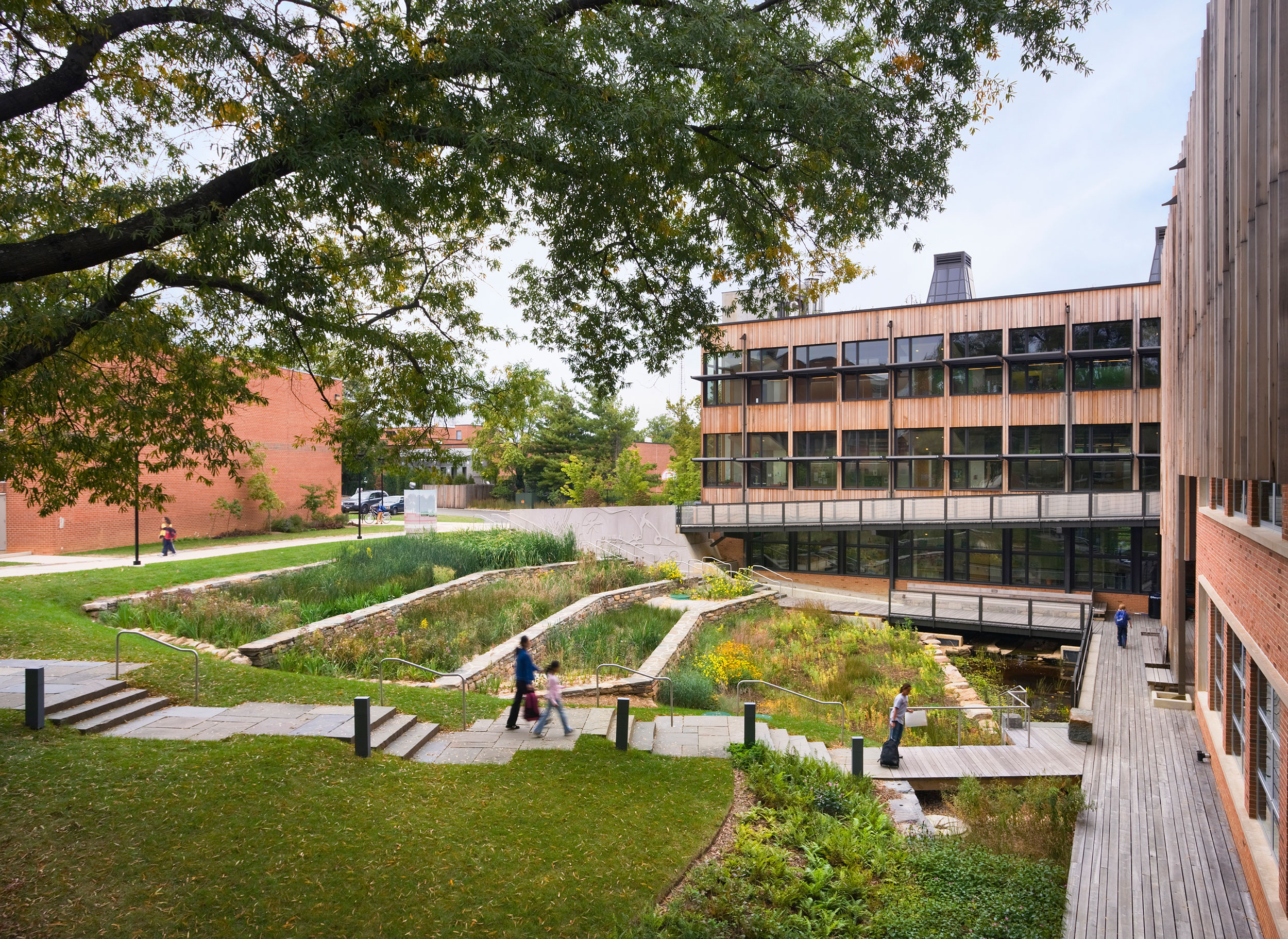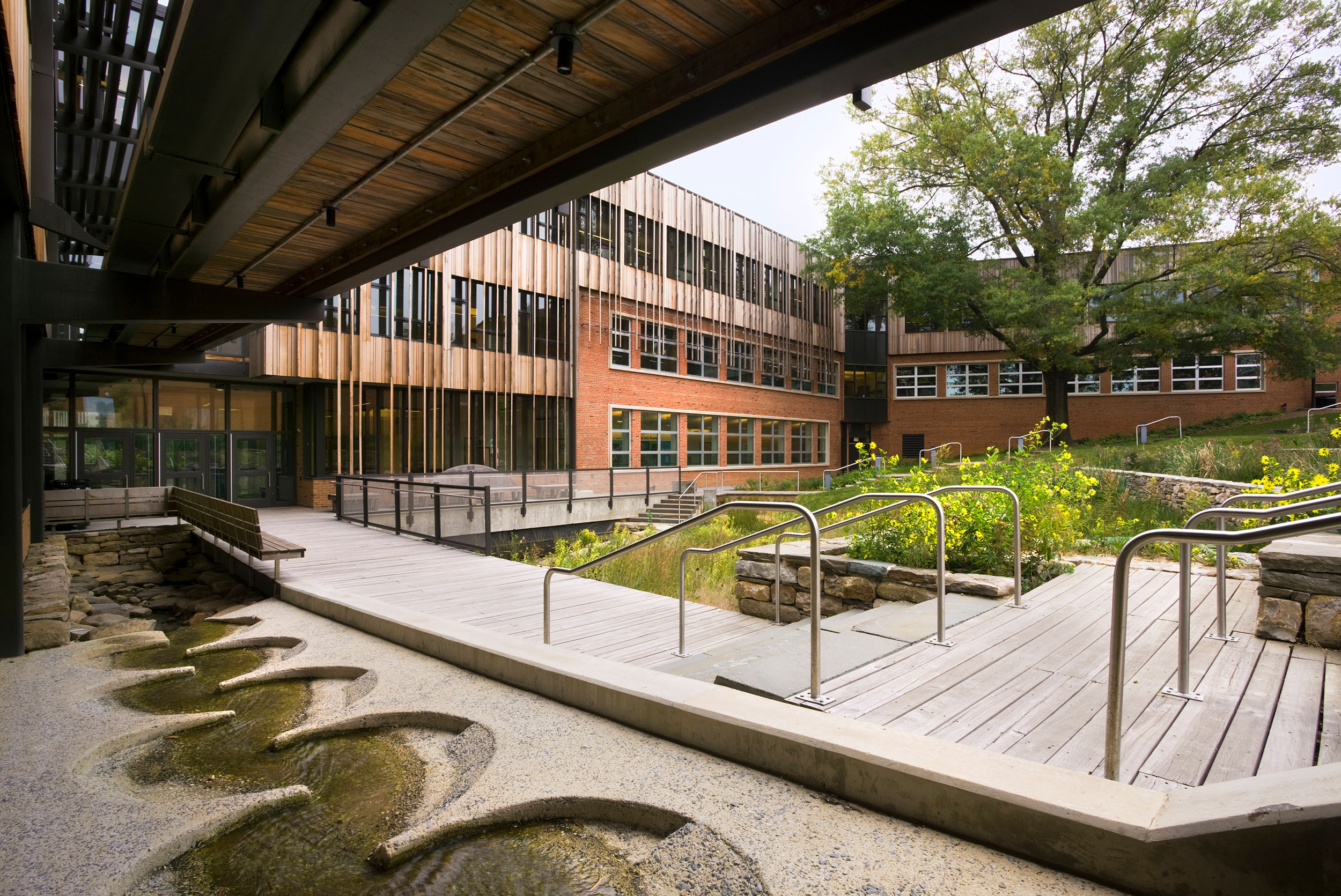 The Stewart Middle School, one of the buildings in the Master Plan, was an awkwardly-sited, undersized, 1950s facility that needed updating and expansion. All water falling on the site was shuttled into poorly repaired underground piping and directed into the municipal storm sewer system. We saw an opportunity to transform the facility into a true teaching landscape—not only inside its classrooms, but also on site—with rooftop gardens and a constructed wetland in the school’s quadrangle as a metaphor for the school’s commitment to sustainability.