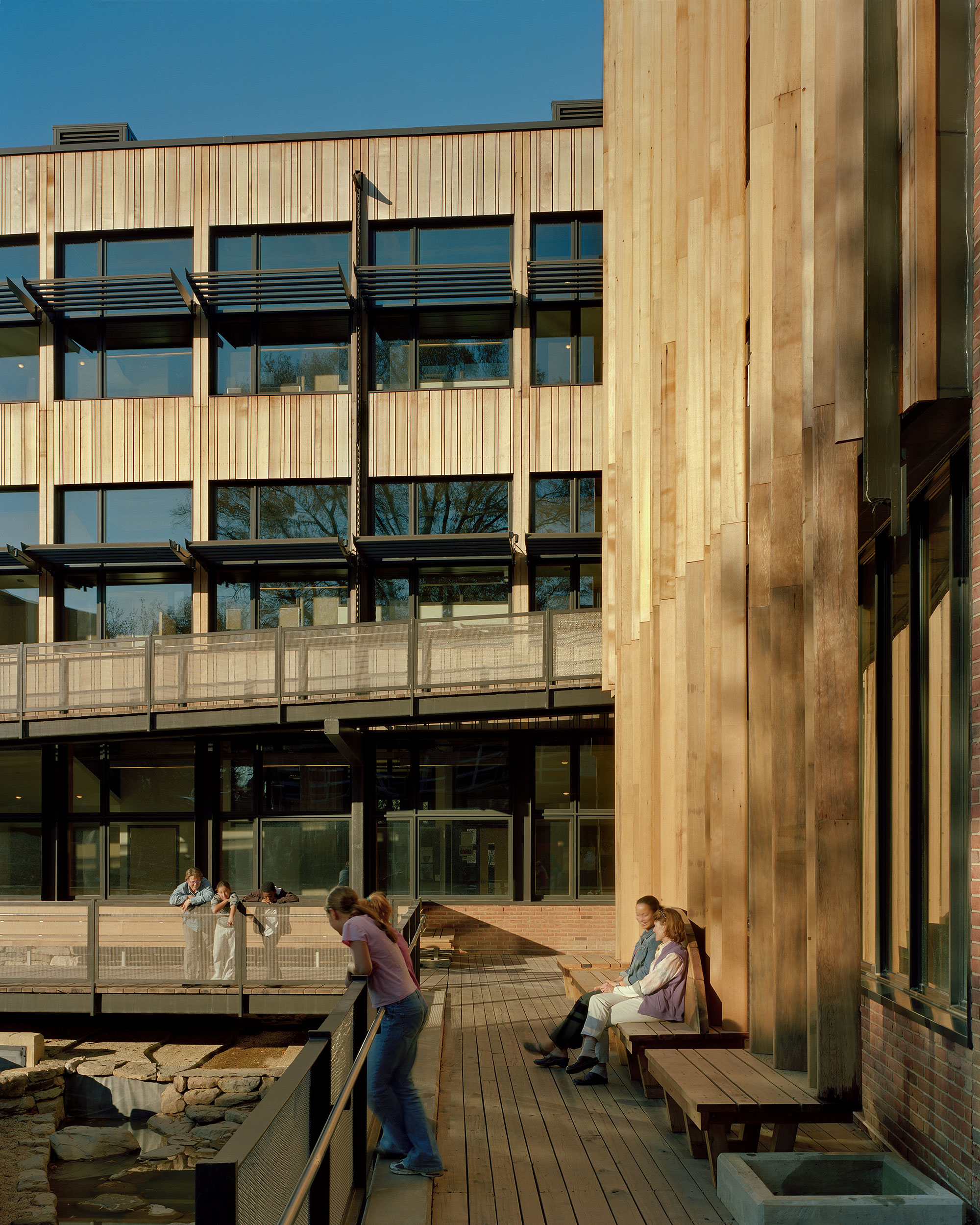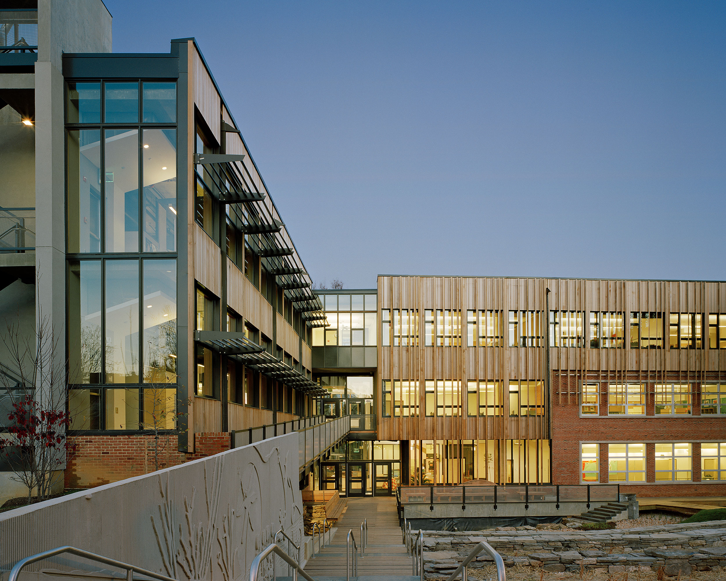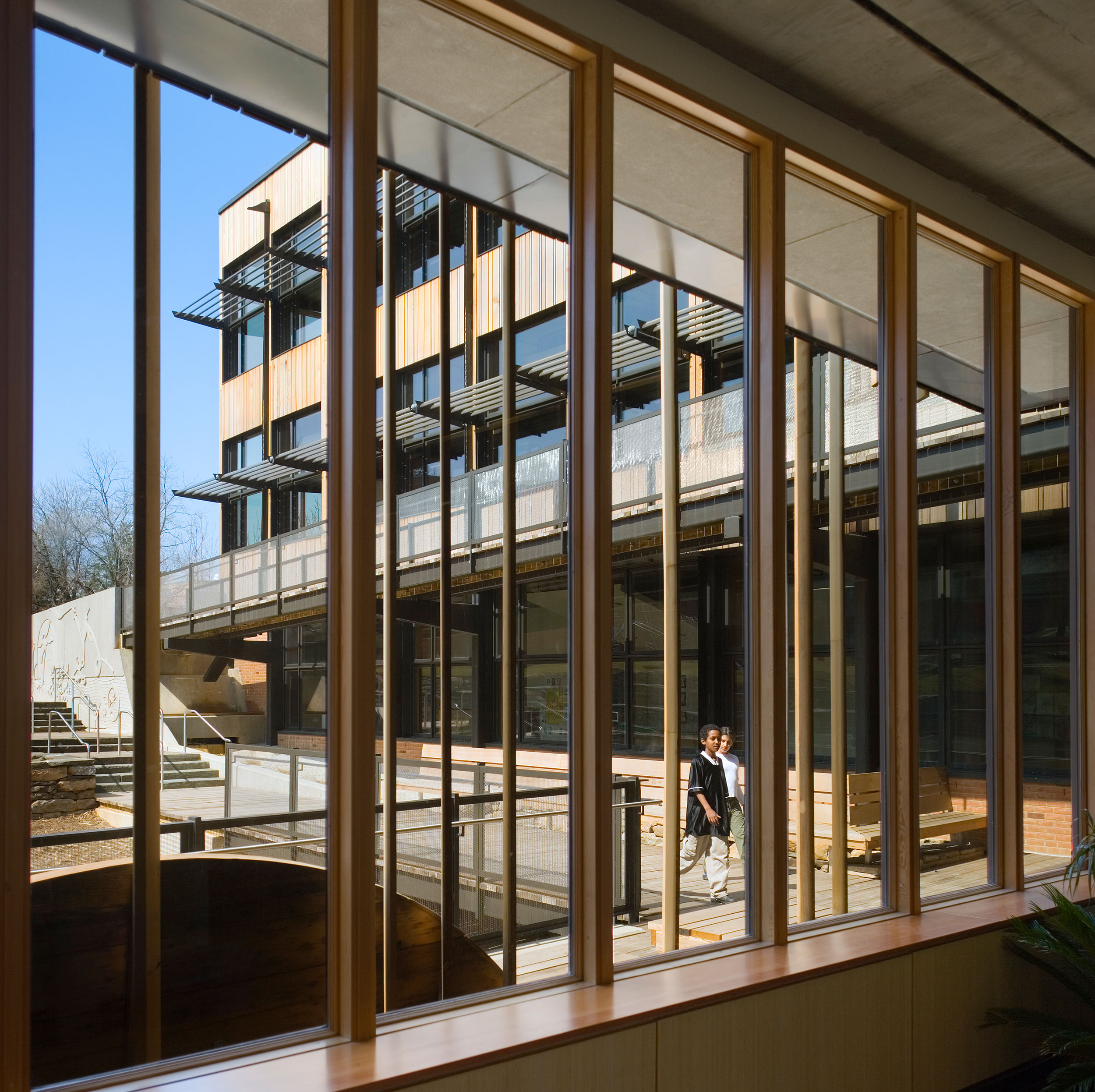 In order to seamlessly integrate new structures, the wood cladding of the addition carries over onto the existing building as sunshades, while the brick of the existing building reaches out around the base of the addition. © Halkin Photography LLC