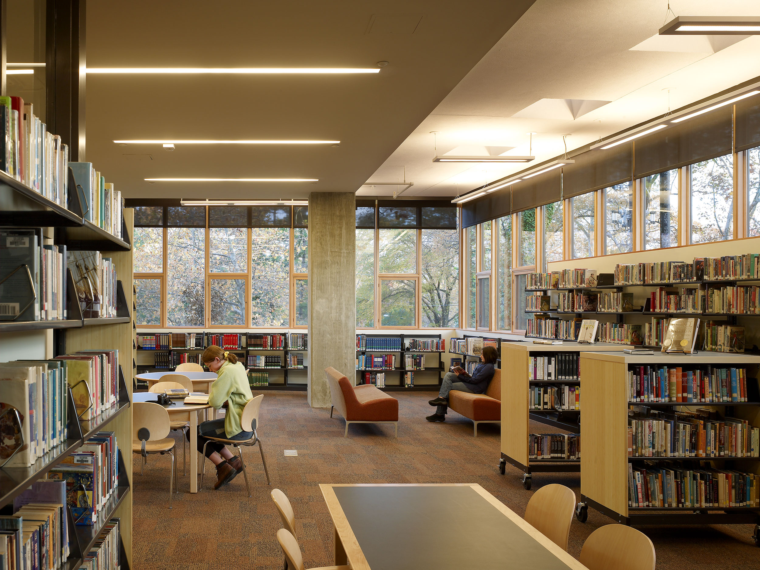 The north-facing library makes use of abundant daylight to create an atmosphere that is open and welcoming for students. © Halkin Photography LLC