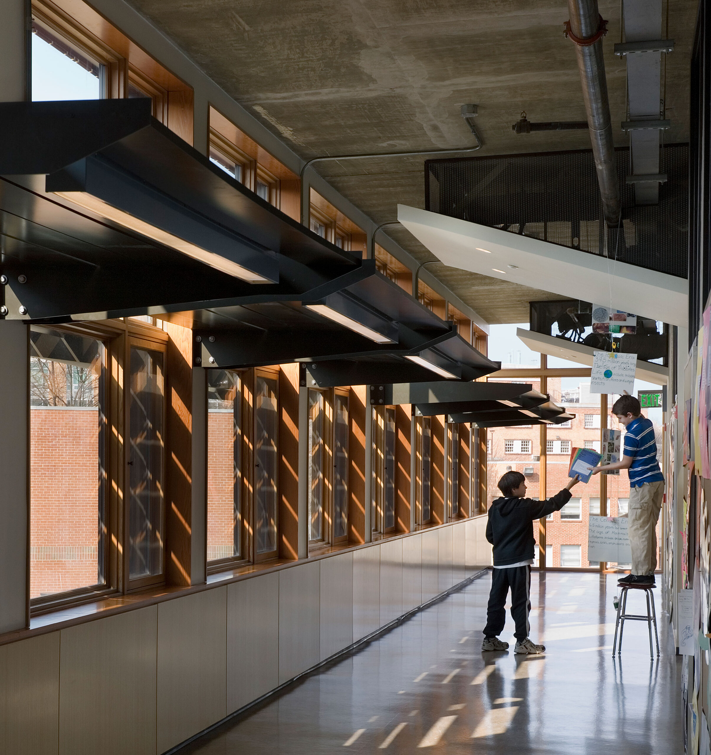 Solar chimneys—designed for passive ventilation, operating without additional energy—provide another learning opportunity about the sun as a primary, renewable source of energy. Sunlight heats air within the glass chimney tops, creating a convection current that draws cooler air into the building through north-facing open windows. Portals in the shaft ways allow students to witness the operation of the ventilation system. Wind chimes ring to indicate the movement of air.